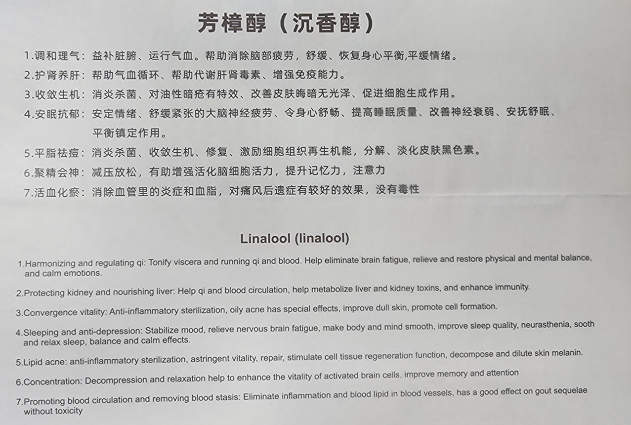 내장을 튼튼하게 하고 기 및 혈액을 순환시킵니다.  뇌 피로를 제거하고 신체적 정신적 균형을 완화 및 회복시키며 감정을진정시킵니다.