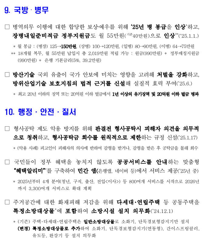 □ 병역의무 이행에 대한 합당한 보상‧예우를 위해 ‘25년 병 봉급을 인상*하고, 장병내일준비적금 정부지원금도 월 55만원(기존40만원)으로 인상**(‘25.1.1.)