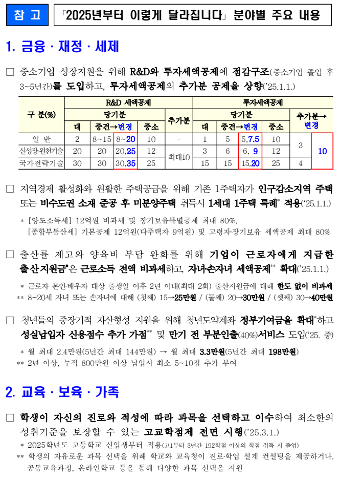 □ 출산률 제고와 양육비 부담 완화를 위해 기업이 근로자에게 지급한출산지원금*은 근로소득 전액 비과세하고, 자녀‧손자녀 세액공제** 확대(’25.1.1.)